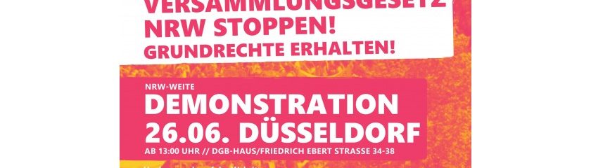 Demonstration in Düsseldorf am Samstag, 26.6.2021, ab 13 UhrDGB-HausFriedrich Ebert Straße 34-38 Dazu eine Informationsveranstaltung: Das geplante #Versammlungsgesetz NRW – Welche Bedeutung hat es für die Zivilgesellschaft? Am 08.06. um 19 Uhr mit @Rechtskritik. Anmeldung unter http://essq.de/versg
