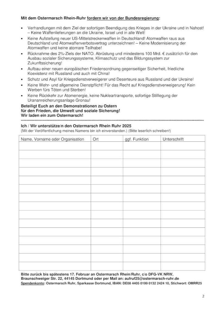 Ich / Wir unterstütze/n den Ostermarsch Rhein Ruhr 2025