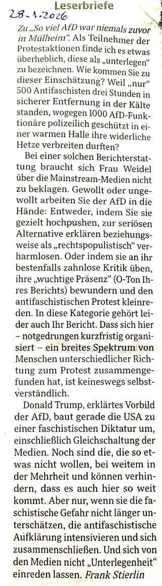 Die AfD hat am letzten Samstag in Mülheim groß auf-getrumpft, wenn auch lange geheim gehalten. WAZ und NRZ brachten dann einen ganzseitigen Bericht, der uns die Stärke der AfD suggerieren soll. Im Anhang (*) dazu ein kritischer Leserbrief von Frank. / (*) Hier: siehe links nebenan.