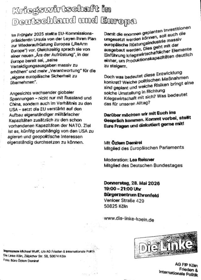 Donnerstag, 28. Mai 2026 19:00-21:00 Uhr Bürgerzentrum Ehrenfeld Venloer Straße 429 50825 Köln